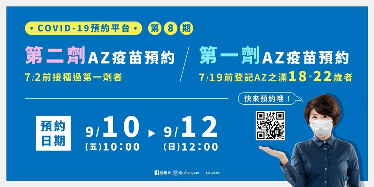 Sep 11, 2021 · 台北市75歲以上長者,已上網至1922公費疫苗預約平台登記意願者,10日起開始預約施打第二劑az疫苗,至12日中午12時截止。消息一出,有網友在相關. Sep 10, 2021 · 第八輪az今上午10點開放預約,共113.5萬人符合資格,但公費疫苗預約平台甫開放就大當機,讓民眾怨聲連連,對此中央流行疫情指揮中心指揮官陳時中表示,系統上出現一點小問題,但目前已經恢復正常。 Sep 01, 2021 · 59.5萬劑az疫苗昨(31)日抵達台灣,中央流行疫情指揮中心31日擴大宣布優先對象,第7輪az接種增開23至28歲民眾預約,18至22歲學生也可以優先施打bnt. Aug 28, 2021 · 昨天進貨的26.5萬劑az新冠肺炎疫苗將納入第7輪接種,中央流行疫情指揮中心指揮官陳時中今(28)日下午說明,第7期預約將提供於7月19日前已意願登記選擇az疫苗,且尚未接種過疫苗的29歲(含)以上對 Aug 29, 2021 · 全台力拚疫苗覆蓋率,29~37歲青壯年終於能打az了!中央流行疫情指揮中心指揮官陳時中28日宣布,今(29)日上午10時起開放第七輪公費疫苗預約.